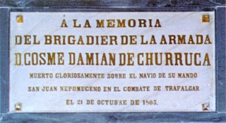 Su navío fue remolcado a Gibraltar, siendo uno de los pocos que pudieron enseñar los británicos como trofeo del combate. Durante unos años lo conservaron, manteniendo la cámara del comandante cerrada y con una lapida en que se leía el nombre de «Churruca» en letras de oro y si algún visitante de alto puesto se le concedía el privilegio de hacerlo, se le advertía que se descubriera como si aún estuviera presente don Cosme Damián de Churruca y Elorza, brigadier de la Real Armada Española, muerto a flote del navío de su mando, el dos baterías y 82 cañones San Juan Nepomuceno.