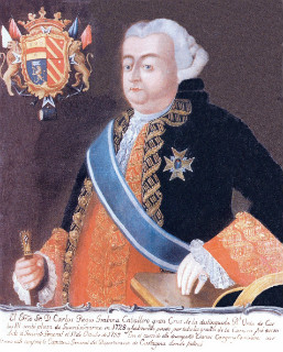 (El escudo del retrato de don Carlos Reggio, está compuesto: En su primer cuartel con las armas de su abuelo Esteban II; segundo cuartel, las armas de su abuelo materno Gravina; tercer cuartel con las armas de su abuela paterna doña Dorotea Brachiforte; cuarto cuartel con las armas de su abuela materna, que también era Gravina. Detrás del escudo aparecen las ocho puntas de la Cruz de la Orden de los Caballeros de San Juan de Jerusalén, y en el pie sobresalen dos cañones, dos anclas y colgando del aspa inferior de la Cruz de San Juan, un tambor. Todo esto último en referencia a su profesión de marino y militar.)